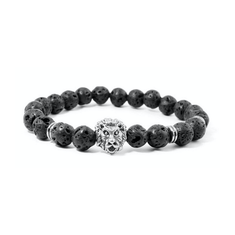 Bracelet lion Argent en pierre de lave naturelle brut et orné d'une tête de lion et anneaux Argent.